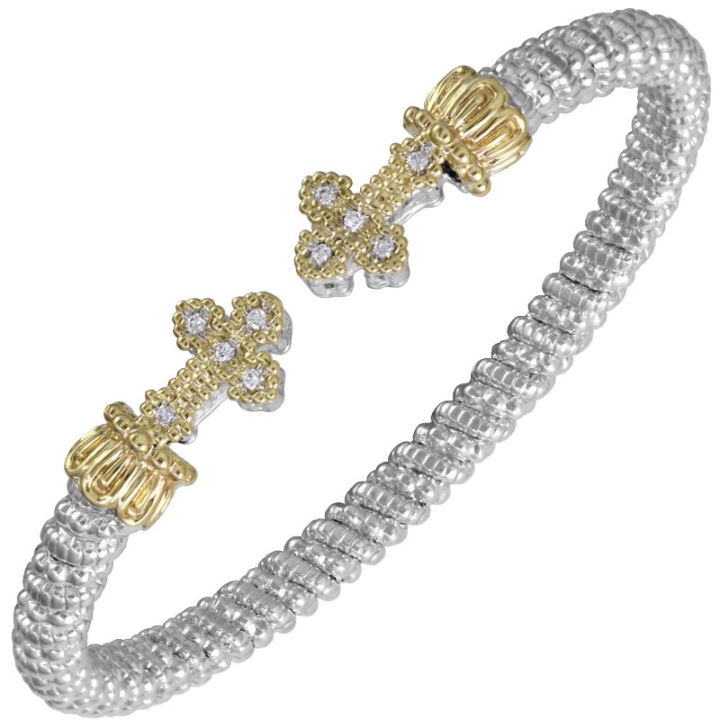 Unit price perShow your spiritual side in style with this elegant Cross bracelet. Crafted in 14KT gold and sterling silver, the classic open silhouette is decorated with 0.10 carats of diamonds. The Moire Beaded pattern brings an intricately textured finish.