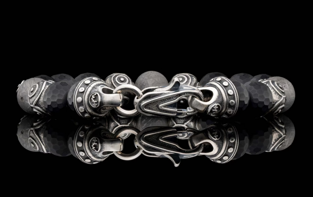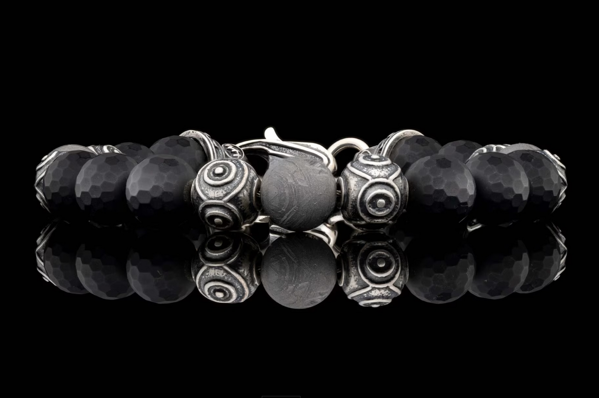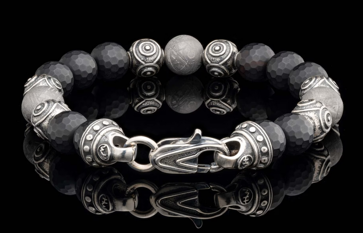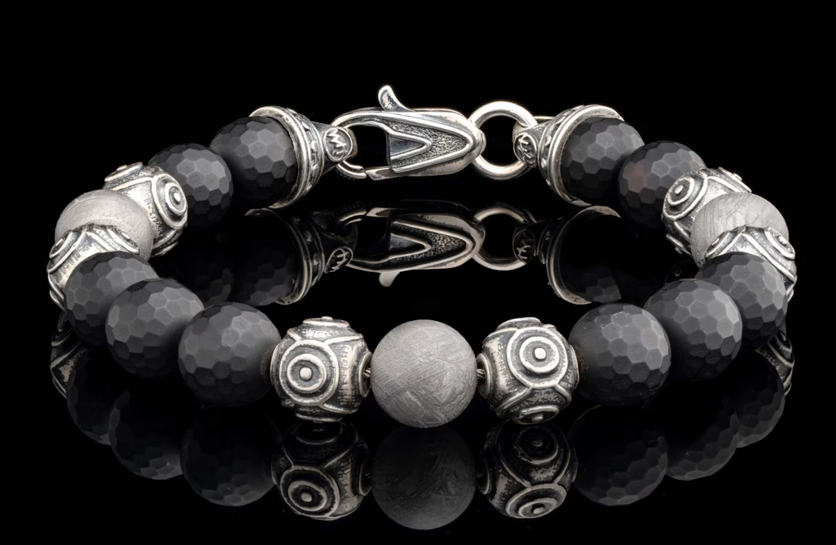 Unit price perEmbark on a journey with the enigmatic 'Monomyth' beaded bracelet by William Henry. This gents bracelet measures 8.75" long (including the trigger clasp), and features 10mm faceted matte black onyx beads, ceramic coated Gibeon meteorite beads, and sculptural patinated sterling silver accent beads that imbue a deep energy from far beyond our galaxy.