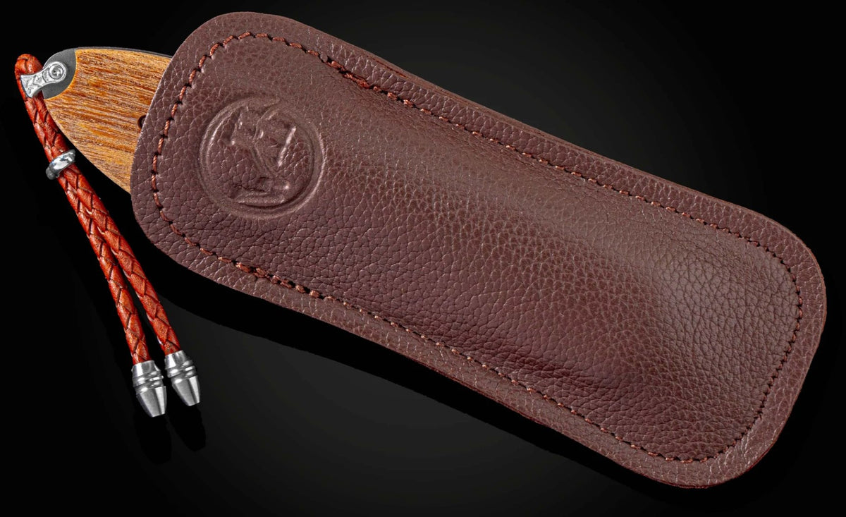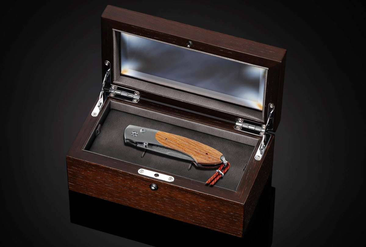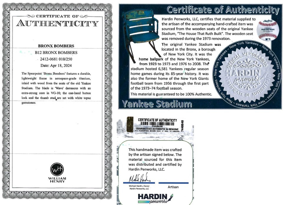 Unit price perThe Spearpoint 'Bronx Bombers' knife features a durable, lightweight frame in aerospace-grade titanium, inlaid with wood reclaimed from the seats of the old Yankee Stadium during the renovation of 1973. The blade is 'Wave' Damascus with an extra-strong core in VG-10; the one-hand button lock and thumb stud are set with white topaz gemstones. All William Henry knives feature a unique serial number engraved into the blade to assure the authenticity and lifetime traceability of the product.