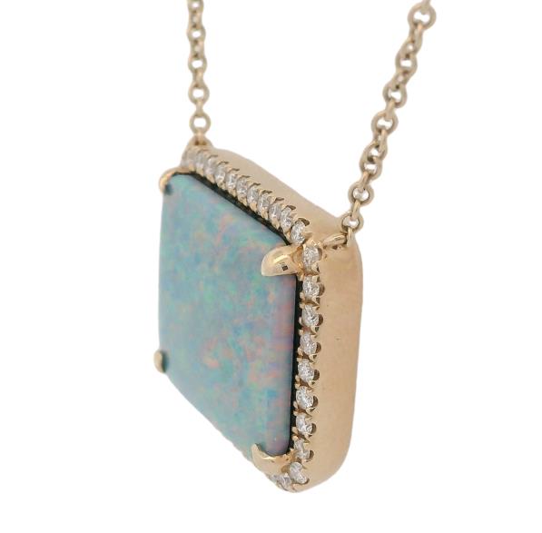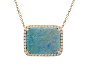 Unit price perThis stunning necklace features a large, rectangle opal, accented by a halo of round diamonds. The necklace is adjustable with jump rings at 16", 17" and 18" with a trigger clasp. This necklace is perfect for any occasion, and would make a great gift for someone special.