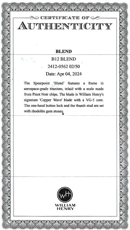 Unit price perThe Spearpoint 'Blend' features a frame in aerospace-grade titanium, inlaid with a scale made from Pinot Noir chips. The blade is William Henry's signature 'Copper Wave' blade with a VG-5 core. The one-hand button lock and the thumb stud are set with rhodolite gemstones. All William Henry knives feature a unique serial number engraved into the blade to assure the authenticity and lifetime traceability of the product.